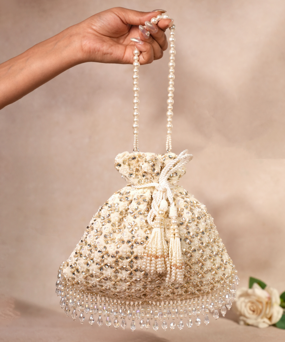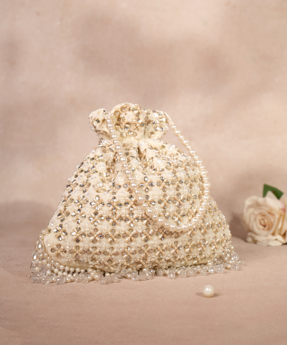 Our Afreen Beige Kundan Embellished Potli Bag is a timeless piece adorned with intricate Kundan work along with sequin work, exuding regal charm. It comes with a pearl handle and a drawstring closure. The delicate tassels at the bottom add a touch of elegance, making it the perfect accessory to complement your festive and bridal ensembles. Product colour may slightly vary due to photographic lighting sources or your monitor settings.