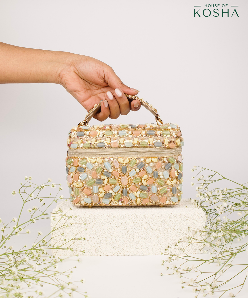 Bold, luminous, and crafted to captivate — the Abia Pastel Georgette Embellished Vanity Bag is a perfect blend of elegance and artistry. Wrapped in soft pastel-toned embroidery on gold georgette, this structured vanity silhouette is adorned with intricate stone, pearl, and cutdana embroidery arranged in floral-inspired motifs that create rich texture and shimmer. The detailed surface work adds dimension and movement, giving the bag a refined festive glow. Designed to comfortably carry your phone along with essentials such as cards, cash, keys, and touch-up makeup, this vanity bag balances beauty with everyday practicality. The secure zip closure keeps belongings protected, while the padded embellished top handle adds strength and makes it easy to carry. Comes with a long chain.