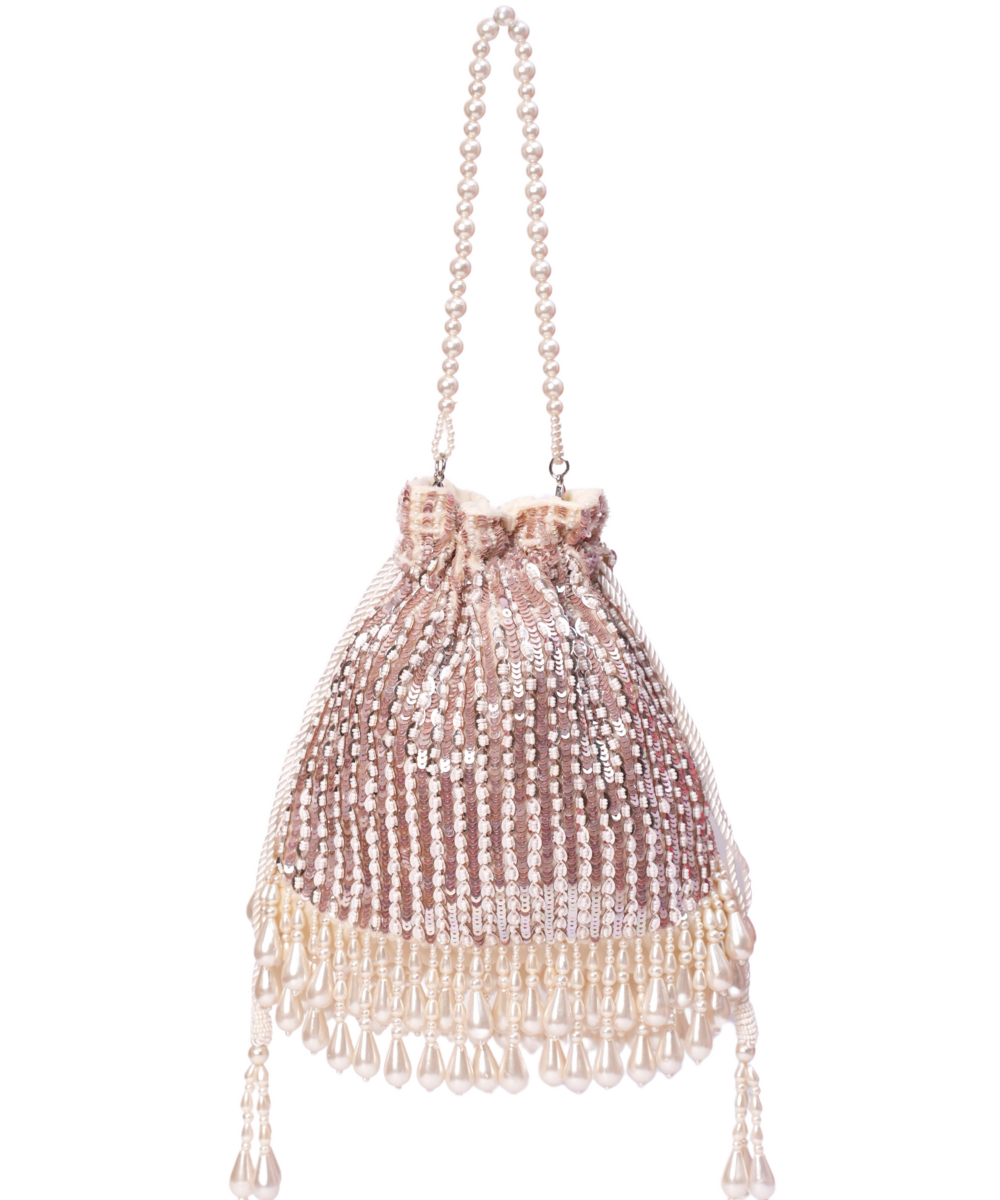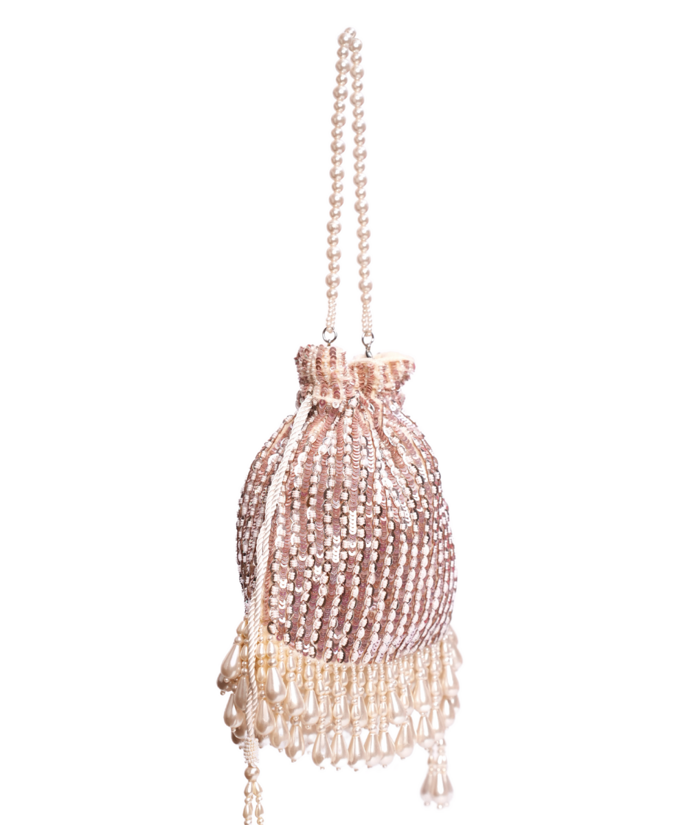Our Aurelia Pink Suede Embellished Potli is a charming blend of elegance and detail. Adorned with pink and contrasting sequins throughout, it features thick pearl latkans at the bottom for a statement touch. The pearl handle adds to its timeless appeal, making it a perfect accessory for any occasion. Product colour may slightly vary due to photographic lighting sources or your monitor settings.