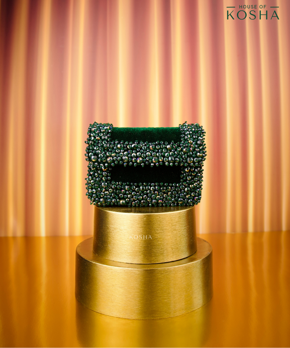 Bold, elegant, and richly detailed - the Elana Green Crystal Embellished Mini Bag is designed for statement evenings. Finished in deep green fabric, this structured mini silhouette is adorned with shimmering crystal embroidery that adds radiant texture. Designed to carry only essentials, this mini bag does not fit a phone and is ideal for cards, cash, keys, and touch-up makeup. The sturdy handle and compact shape offer polished styling for festive nights and special occasions.