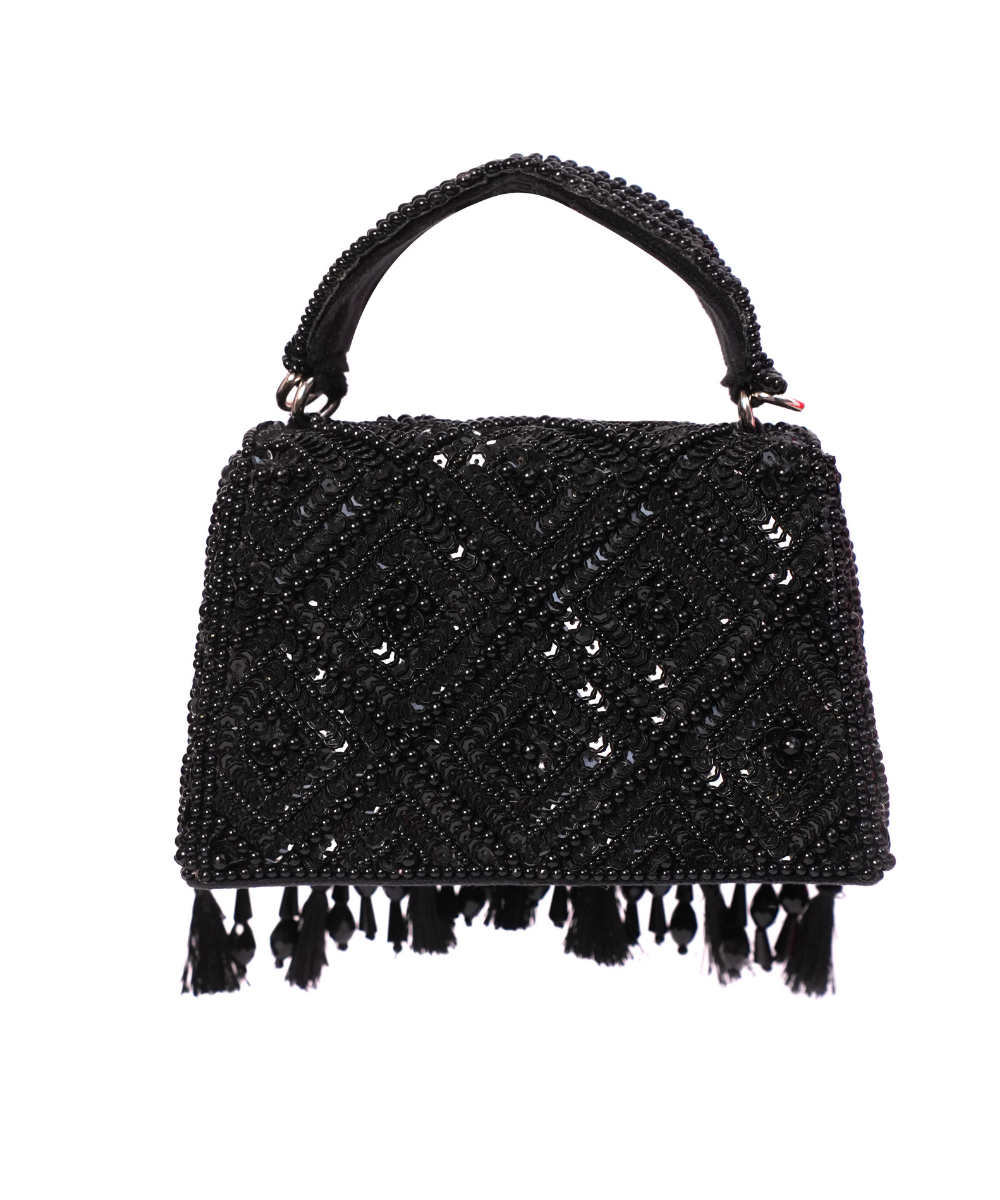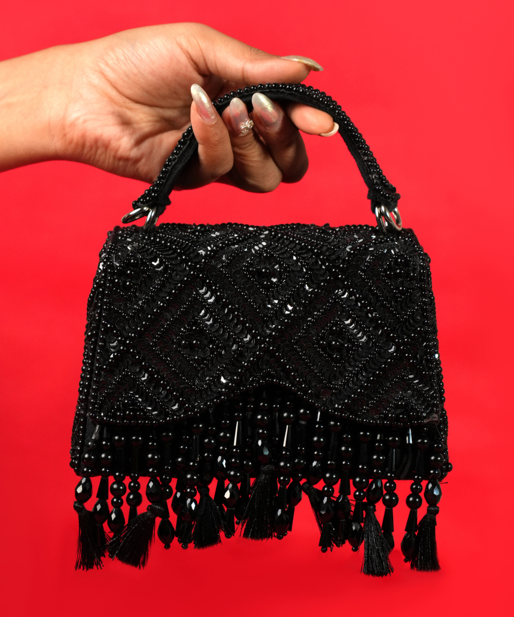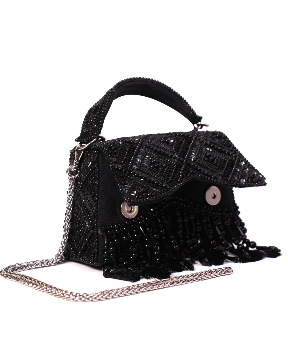 Our Elara Black Suede Embellished Box Bag is a striking blend of texture and elegance. Adorned with intricate sequin and stone embellishments on both the sides of the bag, it features delicate thread tassels, beads and crystal tassels for added charm. The structured box shape offers a sleek look, while the detachable strap provides versatility for effortless styling. Product colour may slightly vary due to photographic lighting sources or your monitor settings.