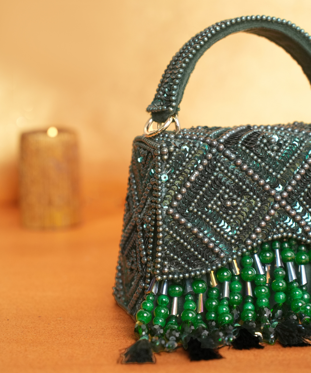 Our Elara Green Suede Embellished Box Bag is a striking blend of texture and elegance. Adorned with intricate sequin and stone embellishments on both the sides of the bag, it features delicate thread tassels, beads and crystal tassels for added charm. The structured box shape offers a sleek look, while the detachable strap provides versatility for effortless styling. Product colour may slightly vary due to photographic lighting sources or your monitor settings.