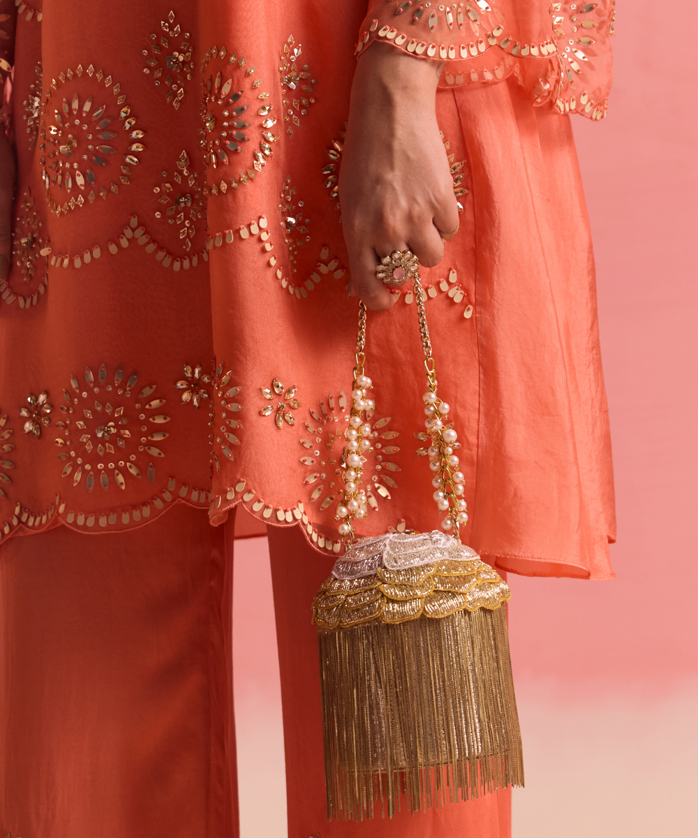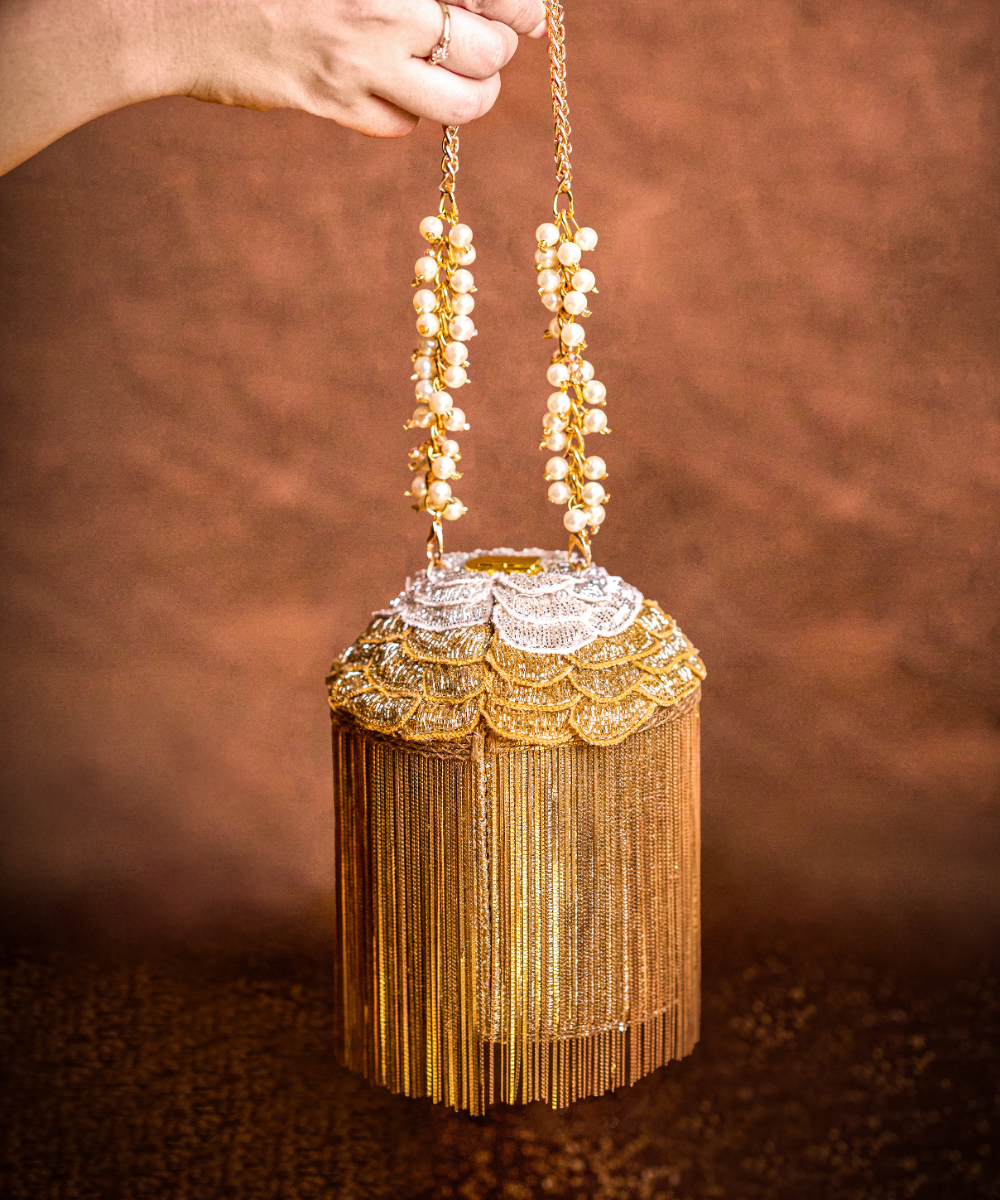 Our Ella Gold Georgette handcrafted Bucket Bag is adorned with cutdana embroidery on the top and high-quality Metallic chain latkans on the entire bag, it is embellished to perfection with intricate details. It is lined with suede inside and has a georgette lining on the outside. The bucket bag comes with a metal strap with pearl detailing. It has a magnetic and buckle closure. Product colour may slightly vary due to photographic lighting sources or your monitor settings.