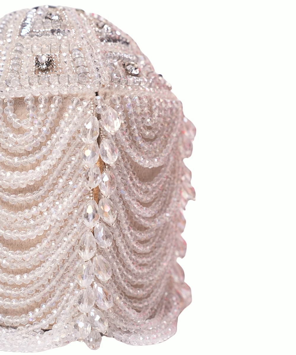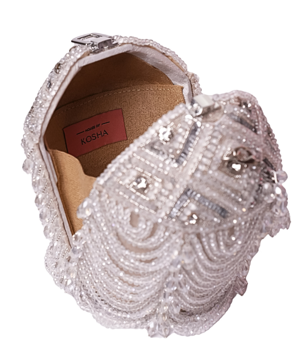Evara Silver Georgette Bucket Bag is adorned with intricate crystal, stones and sequin embroidery on the top and handcrafted crystal latkans on the entire bag, embellished to perfection with intricate details. The bag is lined with suede on the inside and georgette on the outside. Crafted from high-quality materials, this bucket bag is built to last. This collectable statement accessory fits your valuables like makeup, keys, currency, and cards. It comes with a top metal chain with crystals attached. Product colour may slightly vary due to photographic lighting sources or your monitor settings.