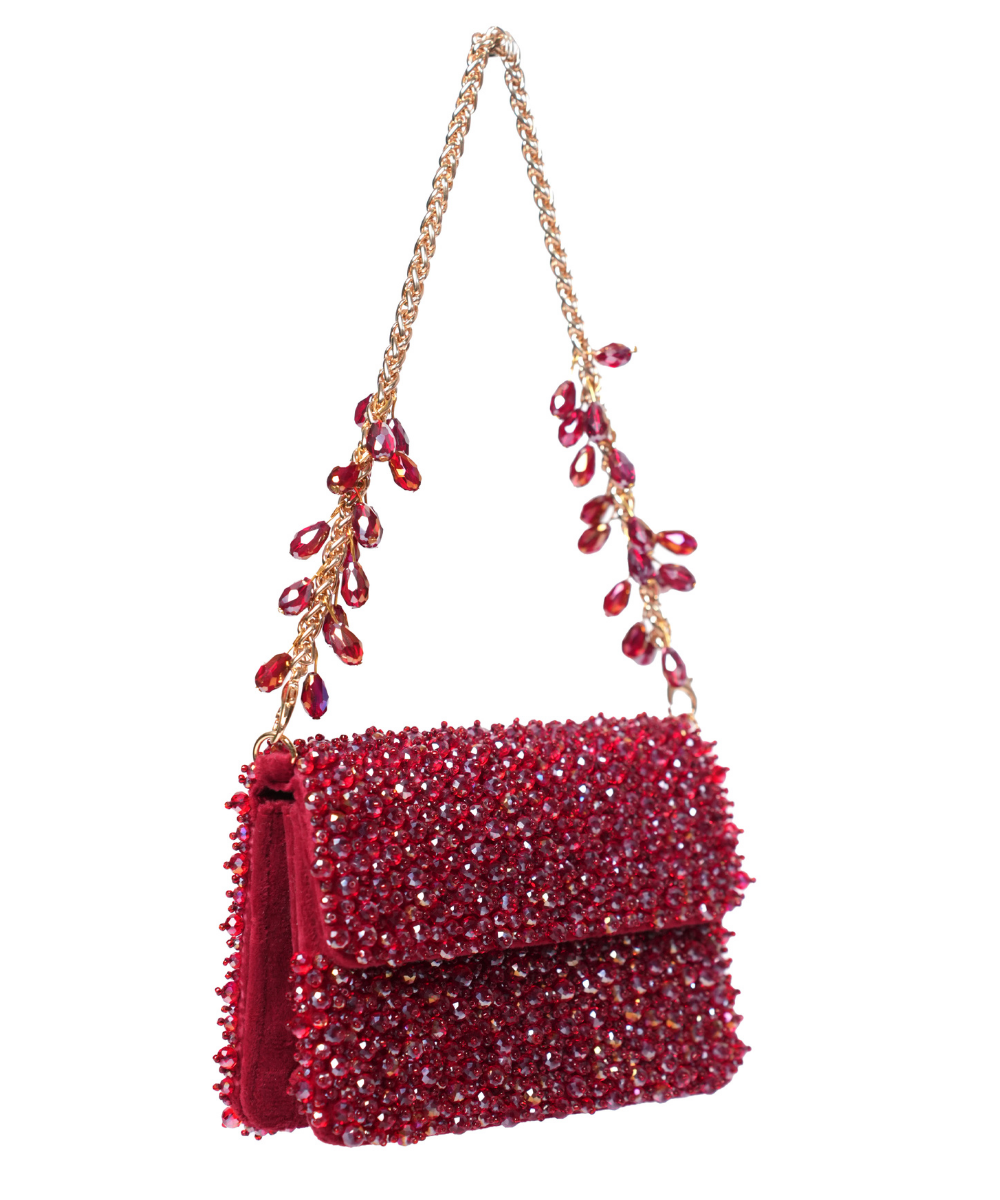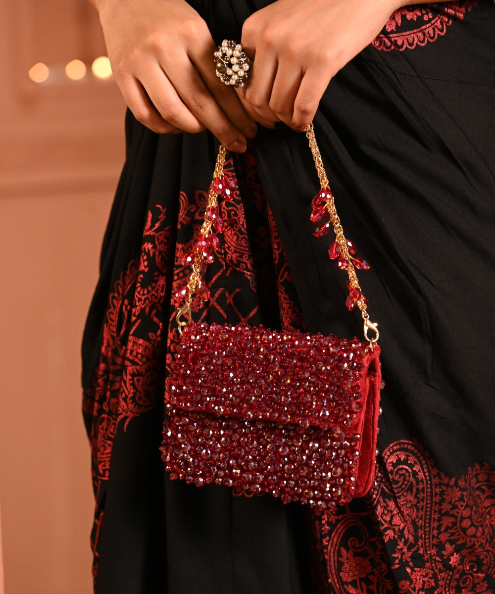 Our Kiyara Maroon Suede Crystal Embellished Mini Clutch Bag is a beautifully handcrafted mini clutch in Maroon with crystals fully embroidered on bag's front and back sides, beautifully crafted on a suede base. It has a magnetic flap closure and a beautiful short metal handle with crystal fallings, representing a playful blend of modern and contemporary aesthetics. Product colour may slightly vary due to photographic lighting sources or your monitor settings.