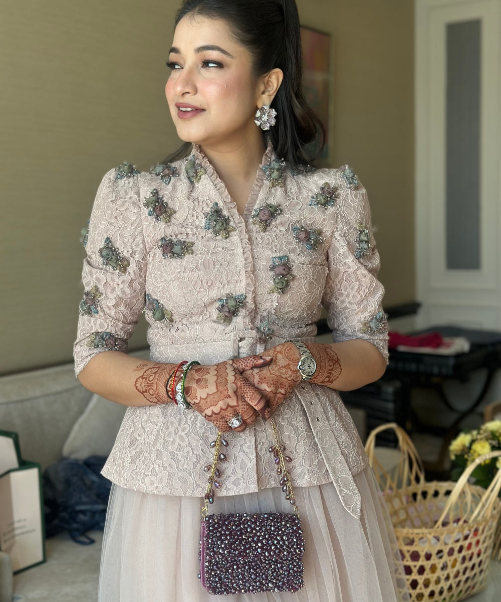 Our Kiyara Mauve Suede Crystal Embellished Mini Clutch Bag is a beautifully handcrafted mini clutch in Purple and Mauve with crystals fully embroidered on bag's front and back sides, beautifully crafted on a suede base. It has a magnetic flap closure and a beautiful short metal handle with crystal fallings, representing a playful blend of modern and contemporary aesthetics. Product colour may slightly vary due to photographic lighting sources or your monitor settings.