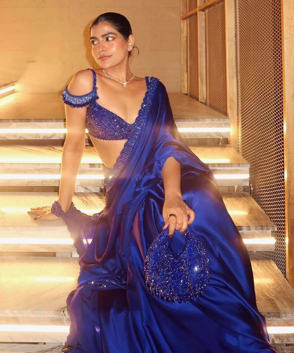 Dive into opulence with the Liona Royal Blue Suede Embellished Hobo Bag Ñ a mesmerising mini bag designed for evenings that demand enchantment. Crafted in a deep royal blue, this crescent-shaped stunner is intricately hand-embroidered with luminous beads and glistening teardrop crystals. The cascading arcs of beadwork create a wave-like texture that reflects elegance with every angle.