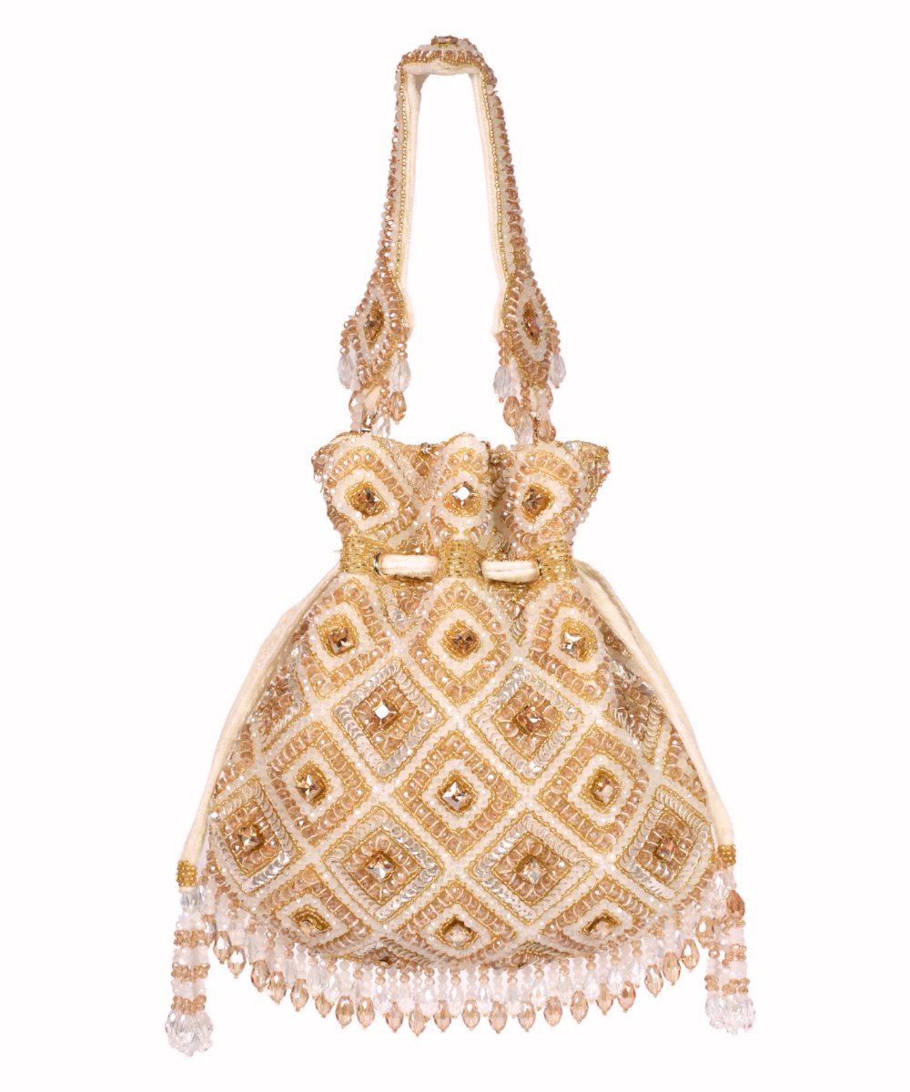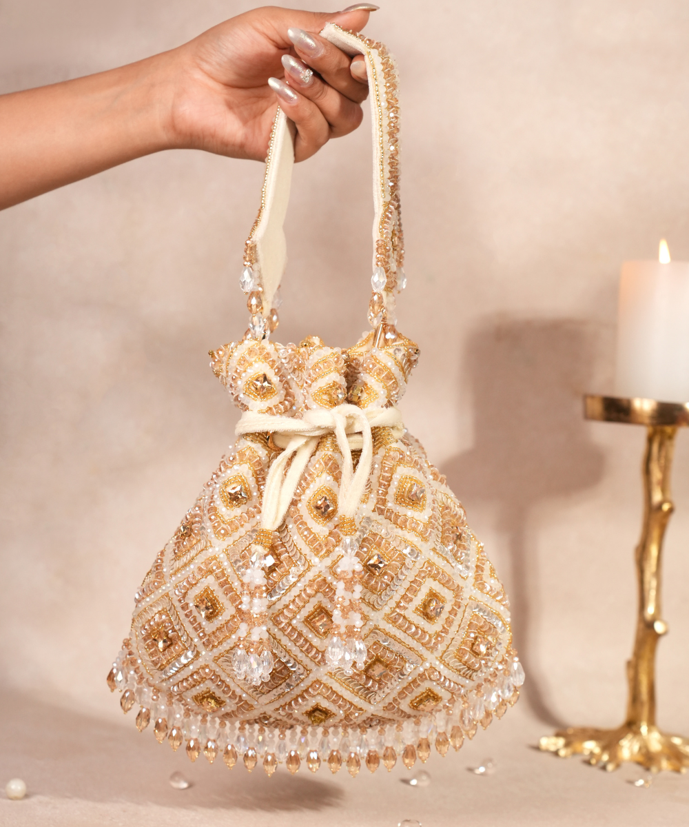 This exquisite Serin Golden Pastel Suede Embellished Potli features intricate craftsmanship with shimmering beads and elegant embellishments. The design combines soft pastel tones of white, gold, and blush pink, creating a sophisticated, eye-catching pattern. The Potli is adorned with delicate golden accents and stunning clear crystals, adding a luxurious touch. It features a unique crescent-shaped handle, making it a standout accessory for both formal and festive occasions. It comes with a drawstring closure. Ideal for those who appreciate intricate detailing and a refined sense of style. Product colour may slightly vary due to photographic lighting sources or your monitor settings.