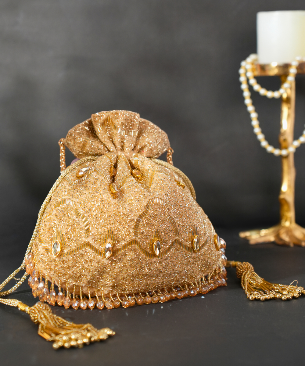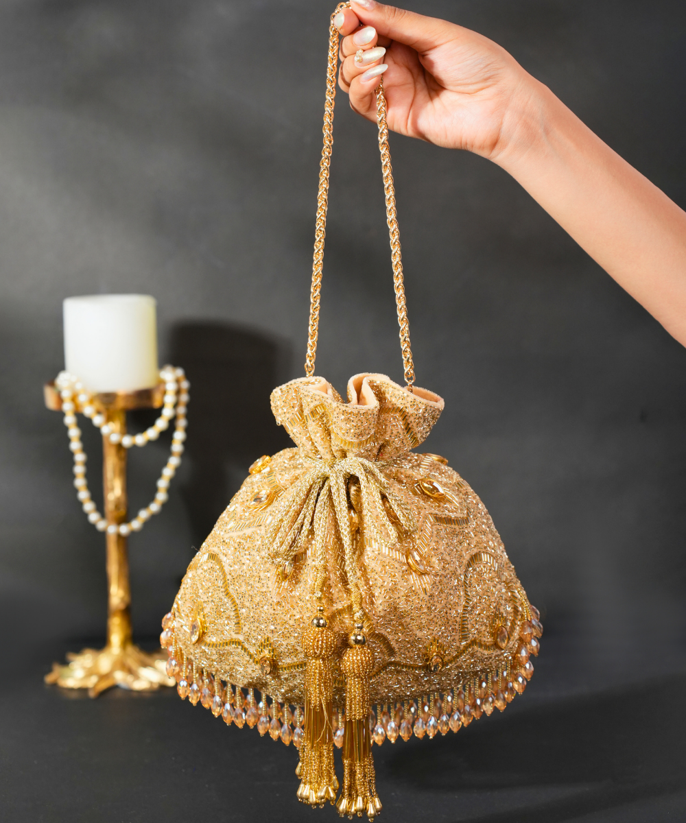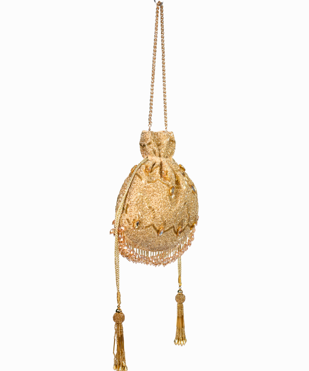 Our Sunheri Gold Georgette Embellished Potli is a luxurious blend of shimmer and sophistication. Adorned with intricate gold cut dana and sequin work, it features strategically placed crystals for added brilliance. The sleek metal handle adds elegance, while the cascading crystal hangings at the bottom enhance its opulent charm. Product colour may slightly vary due to photographic lighting sources or your monitor settings.