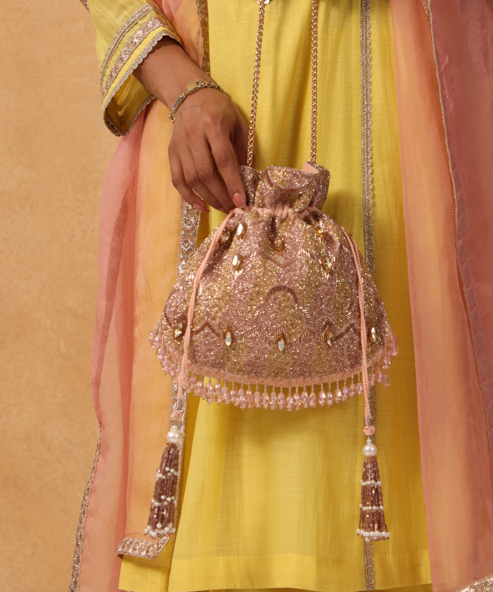 Our Sunheri Gold and Silver Georgette Embellished Potli is a luxurious blend of shimmer and sophistication. Adorned with intricate gold cut dana and sequin work, it features strategically placed crystals for added brilliance. The sleek metal handle adds elegance, while the cascading crystal hangings at the bottom enhance its opulent charm. Product colour may slightly vary due to photographic lighting sources or your monitor settings.