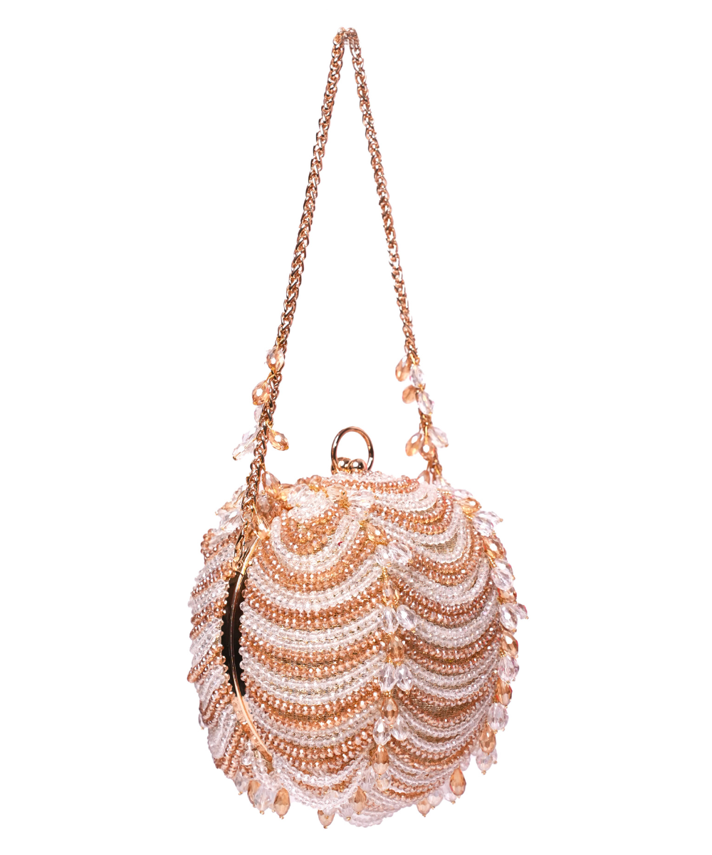 Where heritage meets high glamour, the Velora Gold Georgette Embellished Round Bag is a masterpiece of handcrafted artistry. Embellished with radiant gold and clear silver crystal glass beads in intricate cascading arcs, this round-shaped stunner evokes the regal elegance of palace chandeliers at dusk. Teardrop-shaped crystal accents catch the light at every angle, creating a luminous, golden shimmer with every movement. It has a buckle and a zip closure.