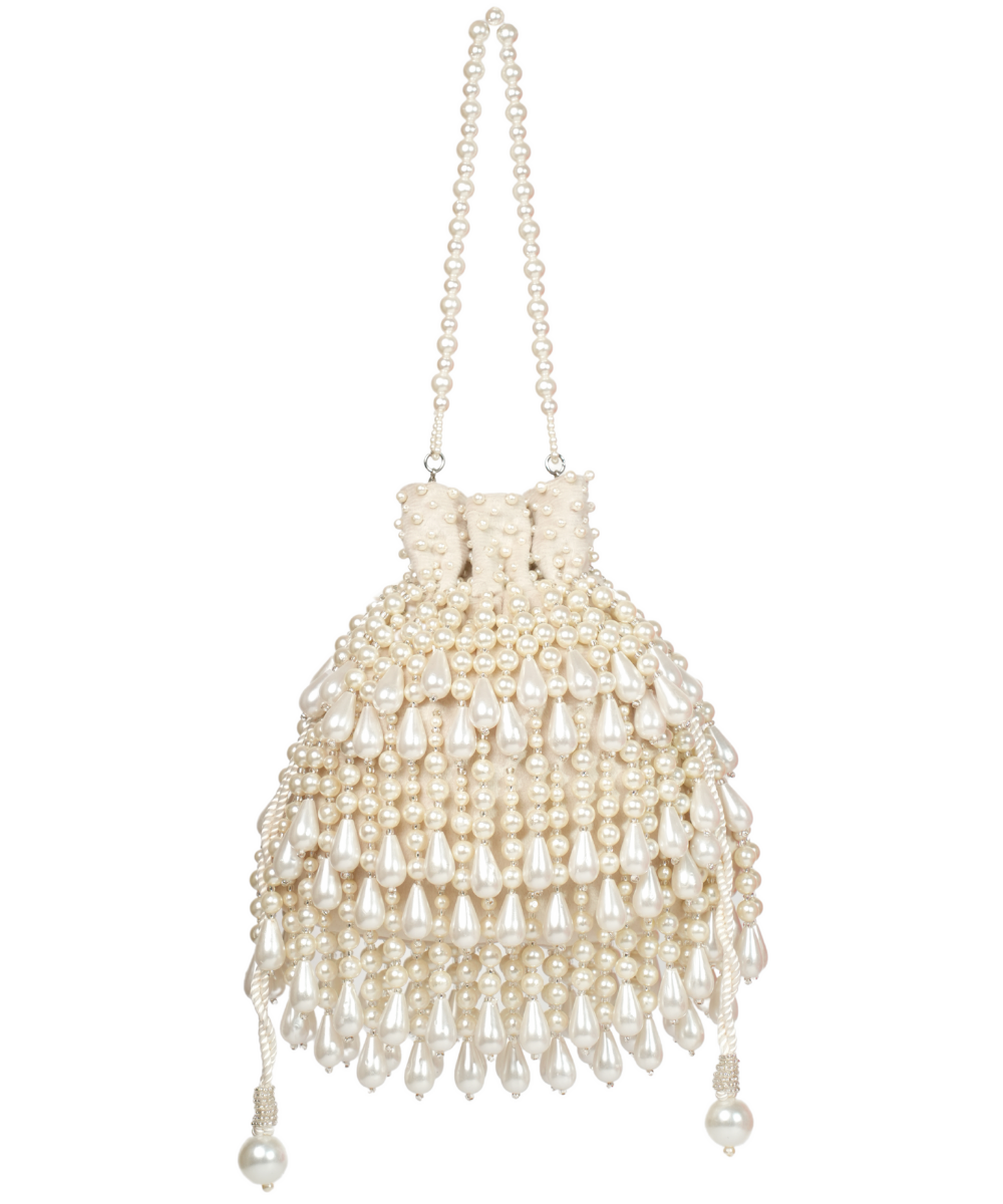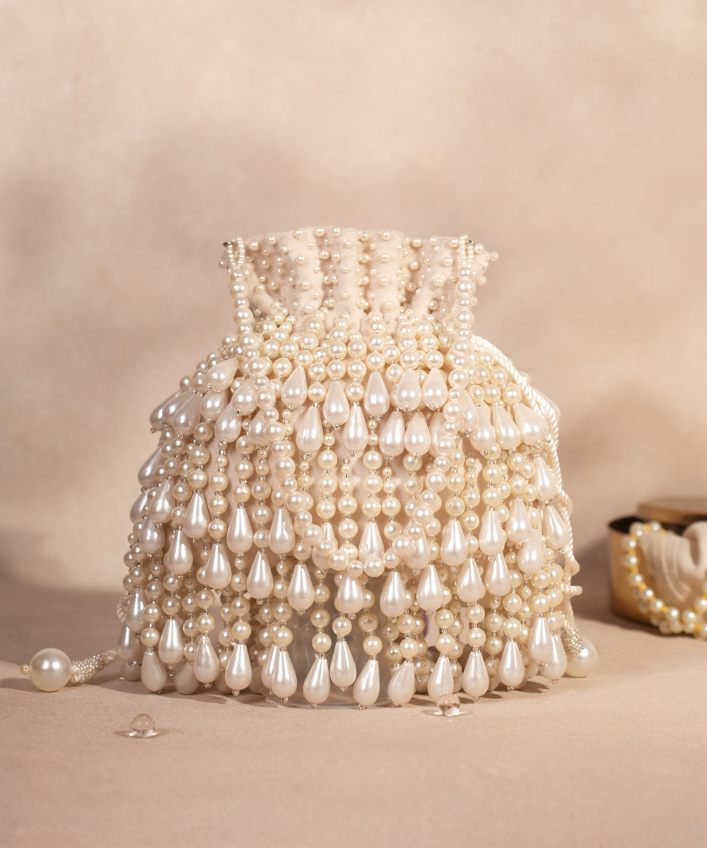 Zarah Ivory Pearl Embellished Potli is hand-crafted with pearls, delicate handmade pearl tassels at the bottom and a pearl beaded handle. Crafted from high-quality materials, this Potli is built to last. This collectable statement accessory fits your valuables like a smartphone, makeup, keys, currency and cards. Product colour may slightly vary due to photographic lighting sources or your monitor settings.